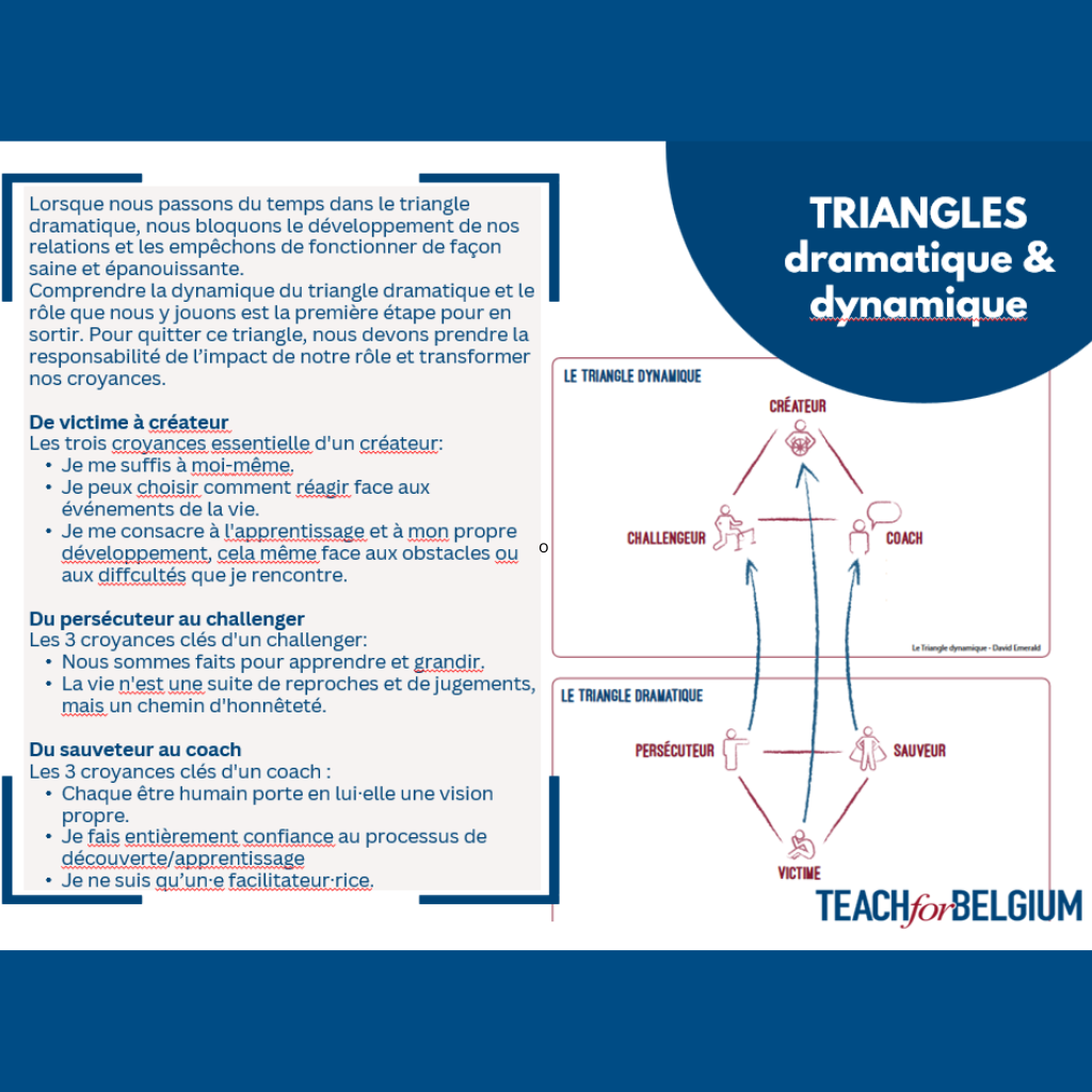Nous initions la réflexion des enseignant·es autour, par exemple, des concepts du triangle dramatique (Karpman) et de son pendant vertueux, le triangle dynamique (Emerald). En tant qu’enseignant·e, comment puis-je aiguiser la conscience de mon positionnement face à une difficulté rencontrée en classe ? Et comment puis-je basculer vers un positionnement plus intéressant (dans le triangle dynamique) si je réalise que je suis resté anglué trop longtemps dans le triangle dramatique ?