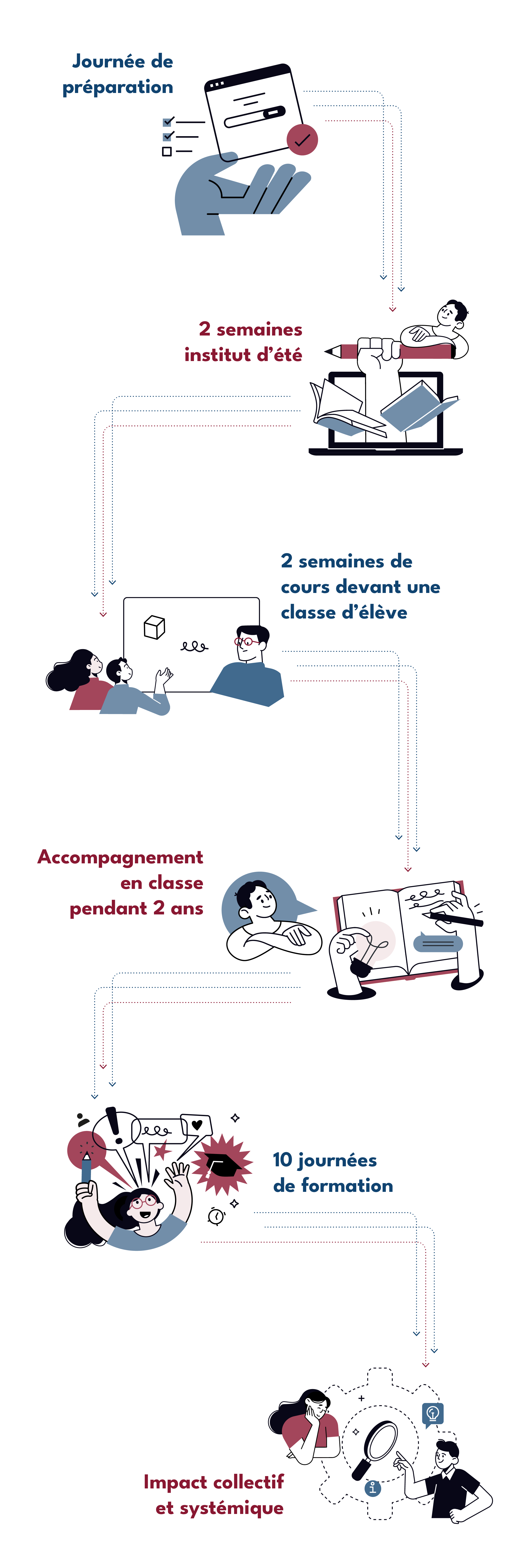 Notre objectif est qu’après les deux ans de formation et d’accompagnement, les participant·e·s se sentent équipé·e·s en tant qu’enseignant·e·s mais aussi en tant qu’acteur·rices de changement pour combattre les iniquités. Vous serez donc formé·e·s dans des domaines tels que :