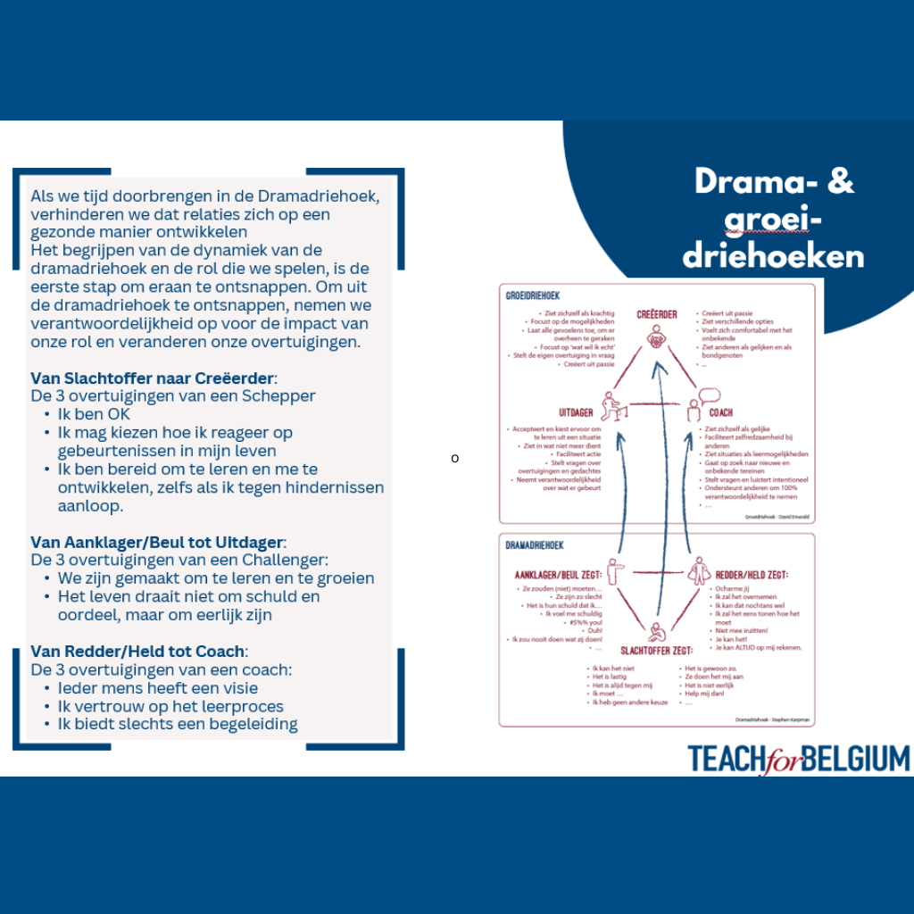 We moedigen leerkrachten aan om na te denken over de concepten van de dramadriehoek (Karpman) en zijn deugdzame tegenhanger, de groeidriehoek (Emerald). Hoe kan ik me als leerkracht bewuster worden van mijn houding als ik geconfronteerd word met een probleem in de klas? En hoe kan ik overschakelen naar een interessantere positie (in de dramadriehoek) als ik me realiseer dat ik te lang in de dramadriehoek ben blijven hangen?